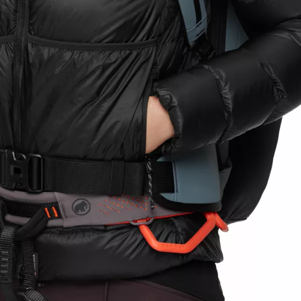- 2 kieszenie boczne na zamek, kompatybilne z uprzężą wspinaczkową i pasem biodrowym plecaka